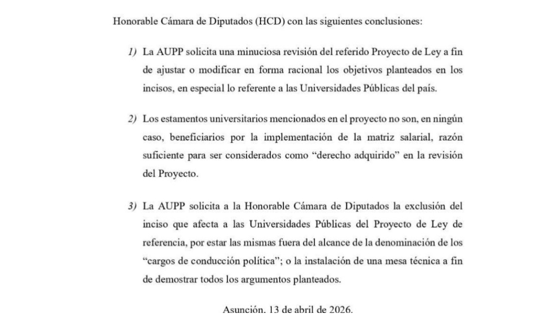 La Asociación de Universidades Públicas del Paraguay (AUPP) solicitó a la Cámara de Diputados una revisión del Proyecto de Ley que suprime, durante el ejercicio fiscal 2026, el pago de bonificaciones a las máximas autoridades de instituciones con cargos de conducción política.